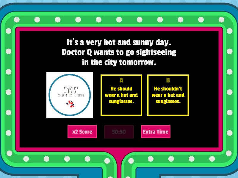 1) It’s a very hot and sunny day. Doctor Q wants to go sightseeing in the city tomorrow. a) He should wear a hat and sunglasses. b) He shouldn't wear a hat and sunglasses. 2) It’s a very hot and sunny day. Doctor Q wants to go sightseeing in the city tomorrow. a) He should stay in the sun for long. b) He shouldn't stay in the sun for long. 3) It’s a very hot and sunny day. Doctor Q wants to go sightseeing in the city tomorrow. a) He shouldn't take a map. b) He should take a map. 4) Millie and Rob are going to stay at home. a) They should look after Pi. b) They shouldn't look after Pi. 5) Millie and Rob are going to stay at home a) They should open the door to everyone. b) They should open the door to all. c) They shouldn't open the door to anyone. d) They should open the door to anyone. 6) Millie and Rob are going to stay at home. a) They should clean the street. b) They shouldn't clean the the house. c) They shold clean the house. d) They should clean the house. e) He should cleans the home. f) She should cleans the house.