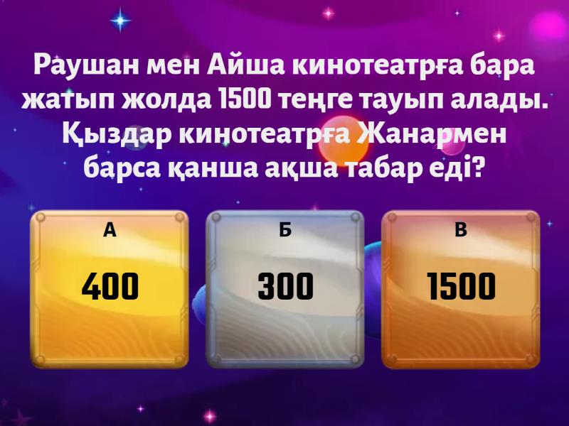 1) Раушан мен Айша кинотеатрға бара жатып жолда 1500 теңге тауып алады. Қыздар кинотеатрға Жанармен барса қанша ақша табар еді? a) 400 b) 300 c) 1500 2) Сізде 5 таяқ бар деп елестетіңіз. Олардың екеуін екіге бөлсеңіз, неше таяқша болады? a) 10 b) 7 c) 2 3) Үстел үстінде төрт стақан компот тұрды. Нұрдос бір стақан компот ішіп, стақанды орнына қойды. Қазір үстелде қанша стақан бар? a) 5 b) 3 c) 4 4) Қайсысы жеңіл: 1 кг мақта ма, әлде 1 кг қағаз ба? a) темір b) тең c) мақта 5) Айнұр мен Санжар 4 сағат қатарынан шахмат ойнады. Олардың әрқайсысы неше сағат ойнады? a) 4 b) 2 c) 6 6) Ағаш басында 7 сауысқан, 4 торғай және 2 тиін отырды. Кенет3 торғай ұшып кетті. Ағашта неше құс қалды? a) 1 b) 4 c) 8 7) Шөпте қояндар тығылып отыр, тек 10 құлағы ғана көрініп тұр. Қанша қоян тығылып отыр? a) 10 b) 5 c) 9 8) Есік алдында емен ағашы бар. Емен ағашында 3 өрік өсіп тұр. Нұржан бір өрікті жұлып алды. Неше алма қалды? a) 2 b) 1 c) 0 9) 560+140-150 a) 50 b) 550 c) 65 10) 2х(130-50) a) 160 b) 15 c) 25 11) Допты лақтырғанда, доп сол ізімен кері қайту үшін оны қалай лақтыру керек? a) жарға b) досыңа c) жоғарға 12) Айдынның Асқардан бойы ұзын, бірақ Жанаттан кіші. Кім ұзын? a) Айдынның b) Асқардың c) Жанаттың
