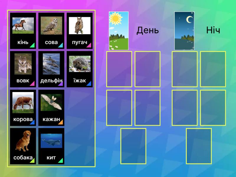 День: собака, кит, дельфін, кінь, корова, Ніч: сова, пугач, їжак, кажан, вовк,