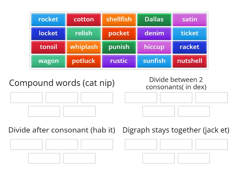 Compound words (cat nip): sunfish, whiplash, potluck, nutshell, shellfish, Divide between 2 consonants( in dex): hiccup, cotton, Dallas, rustic, tonsil, Divide after consonant (hab it): relish, punish, denim, satin, wagon, Digraph stays together (jack et): rocket, ticket, pocket, racket, locket,