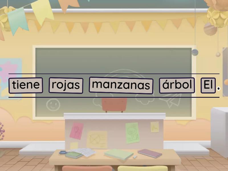 El árbol tiene manzanas rojas., El gato está sobre la alfombra verde., La flor tiene pétalos rosados., El niño está usando una camisa azul., La niña está usando un vestido amarillo., Él está cocinando algunas salchichas., El perro con manchas tiene un hueso., El oso de color café está caminando., El niño está soñando con unicornios., Ella está en el suelo mirando la TV.,