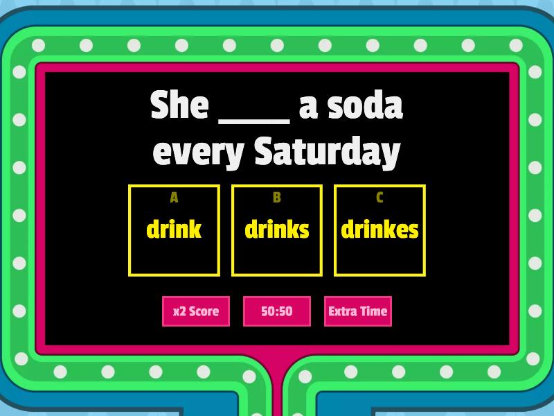 1) She ____ a soda every Saturday a) drink b) drinks c) drinkes 2) He ____ an apple everyday for breakfast a) eats b) eat c) eates 3) He always ____ his wallet when we go out a) forgets b) forget c) forgetes 4) I ____ to school by bus every morning a) go b) goes c) gos 5) We ____ dogs a) likes b) like c) liike 6) She loves to read, she ____ funny novels a) prefer b) prefers c) preefers 7) He ____ music. a) dislike b) dislikes c) disslikess 8) She ____ a lot a) speak b) speaks c) speeks d) speek 9) The sun ____ every day at 6 am a) rise b) rises c) don't rise d) doesn't rise 10) The homework ____ difficult, but it really is a piece of cake a) looks b) look c) looke
