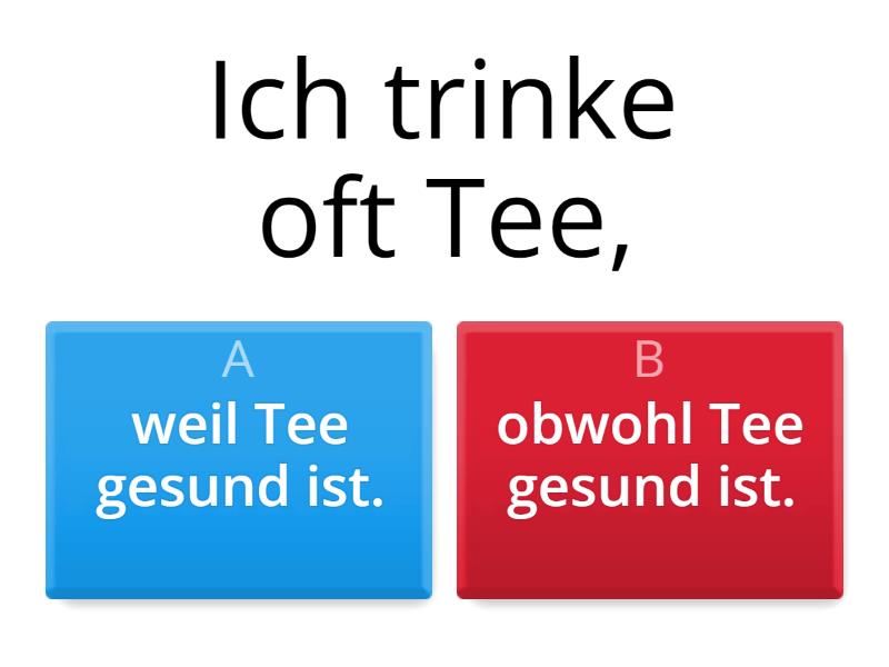 1) Ich trinke oft Tee, a) weil Tee gesund ist. b) obwohl Tee gesund ist. 2) Ich spiele heute Fussball, a) obwohl ich leicht verletzt bin. b) weil ich leicht verletzt bin. 3) Ich lerne Deutsch, a) weil ich in Deutschland lebe. b) obwohl ich in Deutschland lebe. 4) Ich gehe sehr früh schlafen, a) weil ich nicht müde bin. b) obwohl ich nicht müde bin. 5) Ich esse gern Spaghetti, a) weil das mir schmeckt. b) obwohl das mir schmeckt. 6) Ich singe sehr gern, a) obwohl ich keine gute Stimme habe. b) weil ich keine gute Stimme habe. 7) Ich bekomme Medikamente, a) weil ich krank bin. b) obwohl ich krank bin. 8) Ich esse, a) weil ich keinen Hunger habe. b) obwohl ich keinen Hunger habe. 9) Ich mache jeden Tag Sport, a) weil ich fit sein will. b) obwohl ich fit sein will. 10) Meine Familie kauft mir eine Torte, a) weil ich Geburtstag habe. b) obwohl ich Geburtstag habe. 11) Ich lerne, a) obwohl ich morgen einen Test schreibe. b) weil ich morgen einen Test schreibe. 12) Ich rufe meine Freundin an, a) obwohl sie heute Geburtstag hat. b) weil sie heute Geburtstag hat. 13) Ich esse eine Currywurst, a) weil ich Vegetarier bin. b) obwohl ich Vegetarier bin. 14) Ich bin sehr müde, a) weil ich gut geschlafen habe. b) obwohl ich gut geschlafen habe. 15) Ich bin sehr müde, a) weil ich schlecht geschlafen habe. b) obwohl ich schlecht geschlafen habe. 16) Ich gehe im Park spazieren, a) weil das Wetter schön ist. b) obwohl das Wetter schön ist. 17) Ich backe einen Kuchen, a) weil ich nicht gut backen kann. b) obwohl ich nicht gut backen kann. 18) Niko spielt gern Fußball, a) weil er immer verliert. b) obwohl er nie gewinnt.