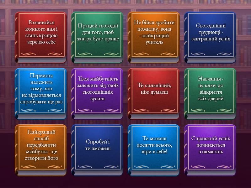 Твоя майбутність залежить від твоїх сьогоднішніх зусиль, Спробуй і ти зможеш, Найкращий спосіб передбачити майбутнє - це створити його, Працюй сьогодні для того, щоб завтра було краще, Навчання - це ключ до відкриття всіх дверей, Перемога належить тому, хто не відмовляється спробувати ще раз, Розвивайся кожного дня і стань кращою версією себе, Ти можеш досягти всього, віри в себе!, Справжній успіх починається з намагань, Ти сильніший, ніж думаєш, Не бійся зробити помилку, вона - найкращий учитель, Сьогоднішні труднощі - завтрашній успіх,