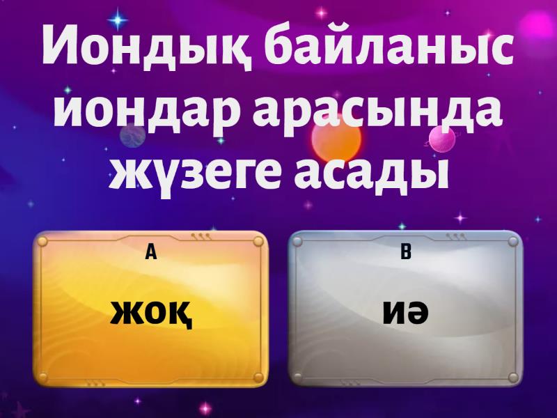 1) Иондық байланыс иондар арасында жүзеге асады a) жоқ b) иә 2) металдар арасында болатын кристалдық тор a) Металдық b) Иондық c) Молекулалық d) Сутектік 3) Ковалентті байланыс екіге бөлінеді a) жоқ b) иә 4) Cl-Cl арасында қандай байланыс? a) Иондық b) Ковалентті полюссіз c) Ковалентті полюсті d) Металдық байланыс 5) K, Na, Ca, Li,Mg a) Аниондар b) Катиондар 6) Химиялық байланыс деген не? a) Атомдар арасындағы тартылыс күшінің жиынтығы b) Иондардың қозғалысын сипаттайтын құбылыс c) Заттың агрегаттық күйін анықтайтын күш d) Электрондардың бейтараптық қасиеті 7) Коваленттік байланыс қалай түзіледі? a) Бір атомнан екінші атомға электрон берілуі арқылы b) Электрондардың иондарға айналуы арқылы c) Ортақ электрон жұбының түзілуі арқылы d) Металдардың еркін электрондары арқылы 8) Иондық байланыс қандай заттарға тән?бір Иондық байланыс қандай заттарға тән? a) Көмірсутек қосылыстарына b) Тек металдар арасында c) Тек бейметалдар арасында d) Металдар мен бейметалдар қосылыстарына 9) Кристалдық торлар қандай түрлерге бөлінеді? a) Иондық, молекулалық, атомдық, металдық b) Тек иондық және молекулалық c) Металдық және бейметалдық d) Қатты және сұйық кристалдар 10) Полюсті коваленттік байланыс қандай жағдайда түзіледі? a) Бірдей атомдар арасында b) Әртүрлі электртерістілігі бар атомдар арасында c) Металл атомдары арасында d) Иондар арасында