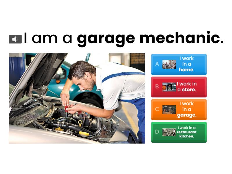 1) I am a garage mechanic. a) I work in a home. b) I work in a taxi. c) I work in a garage. d) I work in a hair salon. 2) I am a caregiver. a) I work in a taxi. b) I work in a home. c) I work in a garage. d) I work in a hair salon. 3) I am a hair stylist. a) I work in a taxi. b) I work in a hair salon. c) I work in a family home. d) I work on a farm. 4) I am a taxi driver. a) I work on a farm. b) I work in a hair salon.. c) I work in a family home. d) I work in a taxi. 5) I am a farmer. a) I work in a home. b) I work on a farm. c) I work in a hair salon. d) I work in a garage. 6) I am a nanny or a babysitter. a) I work on a farm. b) I work in a family home. c) I work in a taxi. d) I work in a hair salon.