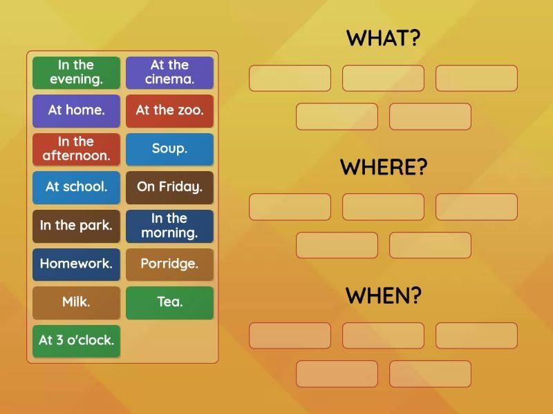 WHAT?: Milk., Homework., Soup., Tea., Porridge., WHERE?: At home., At the zoo., In the park., At school., At the cinema., WHEN?: At 3 o'clock., In the morning., In the afternoon., In the evening., On Friday.,