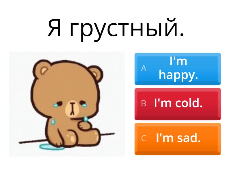 1) Я грустный. a) I'm happy. b) I'm cold. c) I'm sad. 2) Он голодный. a) He's cold b) She's hungry. c) He's hungry. 3) Ей жарко. a) She's hot. b) He's hot. c) She's thirsty. 4) Мы хотим пить. a) We're cold. b) I'm thirsty. c) We're thirsty. 5) Я счастливый. a) I'm hungry. b) I'm happy. c) He's happy. 6) Нам холодно. a) We're cold. b) We're hot. c) He's cold. 7) Она устала. a) She's thirsty. b) She's tired. c) He's tired. 8) Он напуган. a) He's happy. b) He's hungry. c) He's scared.