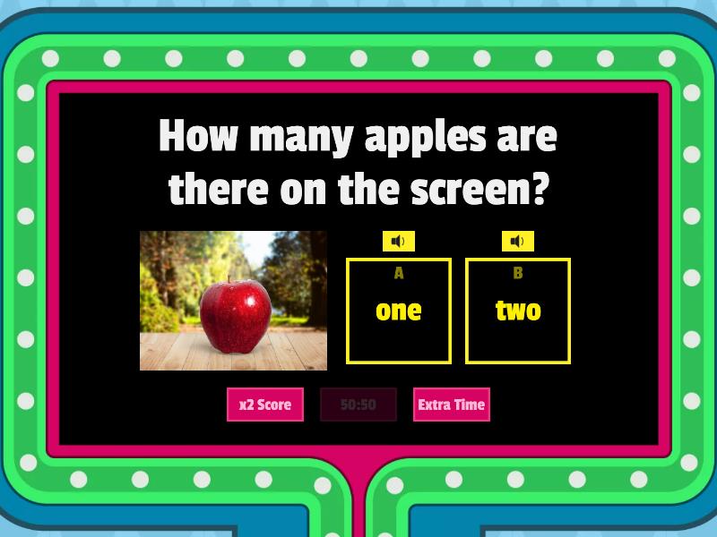 1) How many apples are there on the screen? a) one b) two 2) How many bears are there on the screen? a) one b) two 3) how many toys are there on the screen? a) one b) two 4) how many students are there in the class? a) two b) one 5) how many books are there in the picture? a) one b) two