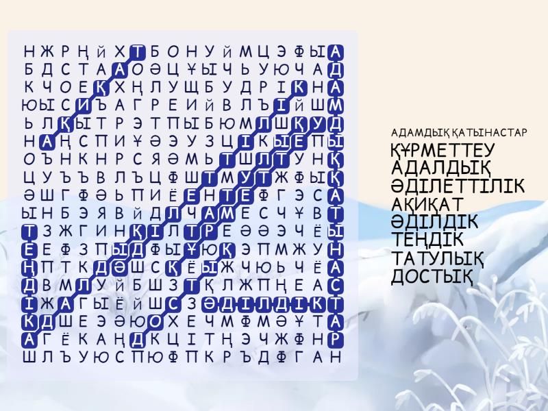 адамдық қатынастар, құрметтеу, адалдық, әділеттілік, ақиқат, әділдік, теңдік, татулық, достық,