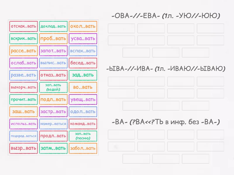 -ОВА-//-ЕВА- (1л. -УЮ//-ЮЮ): проб..вать, затм..вать, продл..вать , во..вать, застр..вать , увещ..вать, намер..ваться , команд..вать, выкорч..вать, бесед..вать, использ..вать, -ЫВА-//-ИВА- (1л. -ИВАЮ//-ЫВАЮ): вспах..вать, разве..вать, доклад..вать, усва..вать, подкрад..ваться, отскак..вать, отказ..вать, выпис..вать, прочит..вать, вскрик..вать, рассе..вать, -ВА- (?ВА<<?ТЬ в инф. без -ВА-): запот..вать, вызр..вать, зап..вать (песню), подл..вать, ослаб..вать, зап..вать (водой), зад..вать, заш..вать, одол..вать, забол..вать, окол..вать,