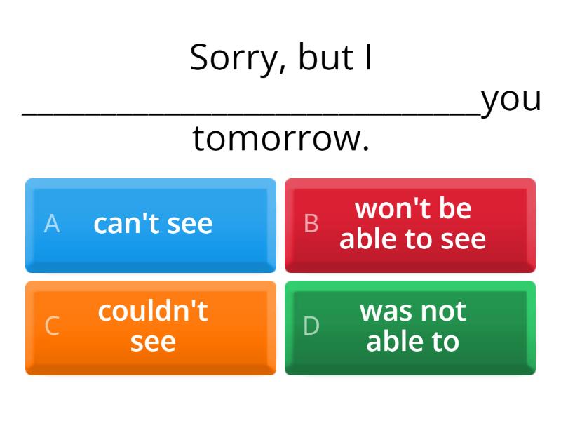 1) Sorry, but I _____________________________you tomorrow. a) can't see b) won't be able to see c) couldn't see d) was not able to 2) Mai ____________________________________three languages when she was three years old. a) can understand b) will be able to understand c) could understand d) was able to understand 3) Pablo is an artist. He ________________________ beautiful pictures. a) can paint b) was able to paint. c) is able to paint d) will be able to paint 4) I __________________________________with you tomorrow, because I have to work. a) couldn't come b) can't come c) won't be able to come d) I wasn't able to come 5) _________________________ the window so that we can get some fresh air. a) I can open b) I couldn't open c) I'm not able to d) I can't open 6) She ___________________________ attend class because she was sick. a) can't b) couldn't c) is able to d) wasn't able to 7) _________________________ come to my party next Saturday? a) Were you able to b) Will you be able to c) Could you d) Can you