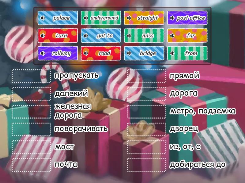 from - из, от, с , get to - добираться до, far - далекий, bridge - мост, post office - почта, road - дорога, railway - железная дорога, underground - метро, подземка, palace - дворец, straight - прямой, miss - пропускать, turn - поворачивать,