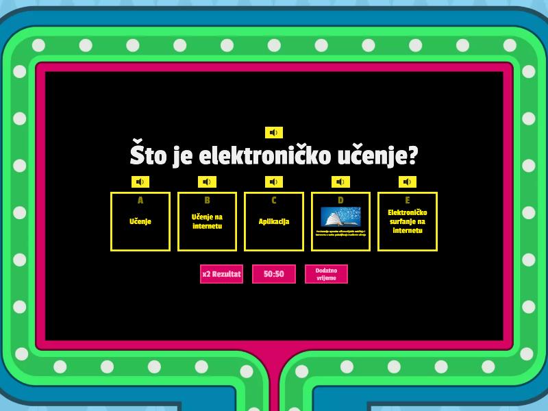 1) Što je elektroničko učenje? a) Učenje b) Učenje na internetu c) Aplikacija d) Predstavlja uporabu višemedijskih sadržaja i interneta u svrhu poboljšanja kvalitete učenja e) Elektroničko surfanje na internetu 2) Što je mrežna zajednica učenja? a) Internetska aplikacija kojoj možemo pristupiti putem mrežnog preglednika b) Zajednica ljudi c) Učenje s prijateljima d) Istraživačka mreža e) Zajednica koja je na mobitelu 3) Što je Moodle? a) Mobilna igrica b) Računalna igrica c) Alat za izradu digitalnih sadržaja d) Aplikacija na kojoj se dopisivamo e) Igrica u kojoj se prelaze prepreke 4) Što je internetski bonton? a) Dok se ponašamo lijepo prema prijateljima b) Pravila pristojnog ponašanja na internetskim mrežama c) Biti ljubomoran na nekoga d) Biti strog prema nekom e) Raditi ono što hoćeš