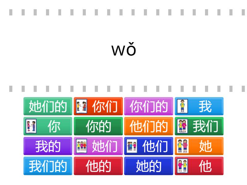 我 - wǒ, 他 - tā (м), 她 - tā (ж), 我们 - wǒmen, 她们 - tāmen (ж), 他们 - tāmen (м), 你 - nǐ, 你们 - nǐmen, 我的 - wǒ de, 我们的 - wǒmen de, 他的 - tā de (м), 他们的 - tāmen de (м), 你的 - nǐ de, 你们的 - nǐmen de, 她的 - tā de, 她们的 - tāmen de (ж),