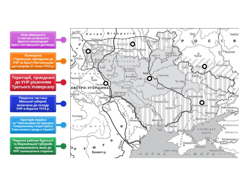 Територія України за "Тимчасовою інструкцією Генеральному Секретаріату Тимчасового уряду в Україні", Території, приєднані до УНР рішенням Третього Універсалу, Холмщина і Підляшшя, приєднані до УНР за Брест-Литовським договором 27 січня 1918 р., Південні райони Курської та Воронезької губерній, приналежність яких до УНР залишалася спірною, Лінія німецького та австро-угорського фронту напередодні Брест-Литовського договору, Південна частина Мінської губернії, включена до складу УНР в березні 1918 р..