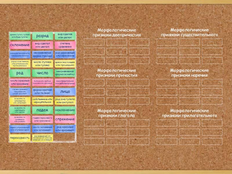 Морфологические признаки деепричастия: неизменяемая форма (пройдя), вид (сделав или делая), возвратность (сделавшись или сделая), Морфологические признаки существительного: одушевленное или неодушевленное, собственное или нарицательное, род, склонение, число, падеж, Морфологические признаки причастия: вид (страдательное или действительное), время (настоящее или прошедшее), вид (совершенный или несовершенный: например, затаенный или читающий), форма (краткая или полная), падеж (отуманенный или отуманенными, род (заряженный или заряженная, число (затаенные или затаенный), возвратность (затаившийся или затаенный), Морфологические признаки наречия: неизменяемая форма (всмятку), степень сравнения, разряд, Морфологические признаки глагола: вид (сделал или делал), спряжение, возвратность (умываюсь или умываю), переходность, наклонение, время (гулял, гуляю или буду гулять), лицо, род (она гуляла или он гулял), число (гуляем или гуляю), Морфологические признаки прилагательного: разряд (качественное, относительное или притяжательное), полное или краткое (красива или красивая), степень сравнения (красивее или самый красивый), число (красивая или красивые), род (красивая или красивый), падеж (красивого или красивом),
