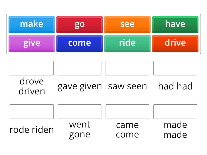 go - went gone, see - saw seen, ride - rode riden, drive - drove driven, come - came come, have - had had, make - made made, give - gave given,
