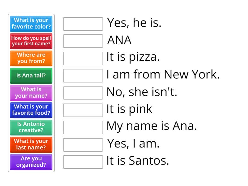 What is your name? - My name is Ana., Where are you from? - I am from New York., What is your last name? - It is Santos., How do you spell your first name? - ANA, Are you organized? - Yes, I am., Is Antonio creative? - Yes, he is., Is Ana tall? - No, she isn't. , What is your favorite color? - It is pink, What is your favorite food? - It is pizza.,