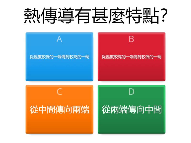 1) 熱傳導有甚麼特點? a) 從溫度較低的一端傳到較高的一端 b) 從溫度較高的一端傳到較低的一端 c) 從中間傳向兩端 d) 從兩端傳向中間 2) 以下哪種物料適合用來製作金屬水煲的手柄? a) 塑膠 b) 鐵 c) 銅 d) 以上三項皆不正確 3) 以下哪些是安全地處理燙熱物件的方法?(答案可多於一個。) a) 利用錫紙包着燙熱物件後才拿起 b) 使用隔熱手套拿起燙熱物件 c) 把燙熱物件放在膠碟上才拿起 d) 直接用手拿取物件 4) 金屬遇熱時會有甚麼變化? a) 膨脹 b) 收縮 c) 不變 d) 以上三項皆不正確 5) 金屬遇冷時會有甚麼變化? a) 膨脹 b) 收縮 c) 不變 d) 以上三項皆不正確 6) 我們可以用身體哪部分來分辨冷熱? a) 皮膚 b) 眼睛 c) 頭髮 d) 指甲 7) 以下哪種工具可以用來測量物體的温度? a) 酒精燈 b) 熱水壺 c) 温度計 d) 筷子
