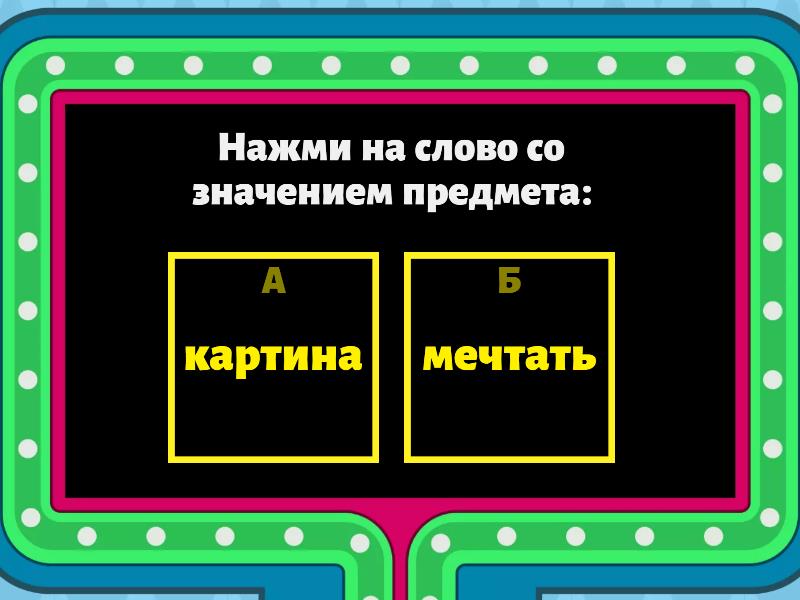 1) Нажми на слово со значением предмета: a) картина b) мечтать 2) Нажми на слово со значением предмета: a) пузырь b) круглый 3) Нажми на слово со значением предмета: a) артист b) пушистый 4) Нажми на слово со значением предмета: a) парк b) добрый 5) Нажми на слово со значением предмета: a) надувать b) карусель 6) Выбери верный вариант ответа a) Клоун (гл.) показывает весёлые фокусы (сущ.) b) Клоун показывает (сущ.) весёлые фокусы c) Клоун (сущ.) показывает весёлые фокусы (сущ.) 7) Выбери верный вариант ответа a) Мыльные пузыри (сущ.) летели над крышами (сущ.) b) Мыльные (сущ.) пузыри летели (сущ.) над крышами c) Мыльные пузыри (сущ.) летели (сущ.) над крышами