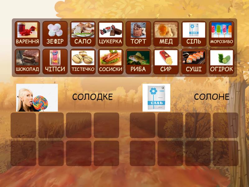 СОЛОДКЕ: ЦУКЕРКА, МОРОЗИВО, ШОКОЛАД, ТОРТ, ТІСТЕЧКО, ВАРЕННЯ, МЕД, ЗЕФІР, СОЛОНЕ: СУШІ, ОГІРОК, СОСИСКИ, РИБА, СИР, САЛО, ЧІПСИ, СІЛЬ,