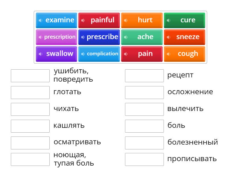 ache - ноющая, тупая боль, sneeze - чихать, cough - кашлять, pain - боль, painful - болезненный, hurt - ушибить, повредить, swallow - глотать, examine - осматривать, prescribe - прописывать, prescription - рецепт, cure - вылечить, complication - осложнение,