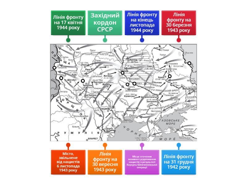 Лінія фронту на 31 грудня 1942 року, Лінія фронту на 30 березня 1943 року, Лінія фронту на 30 вересня 1943 року, Лінія фронту на 17 квітня 1944 року, Місце оточення великого угруповання нацистів в результаті Корсунь-Шевченківської операції, Лінія фронту на кінець листопада 1944 року, Західний кордон СРСР, Місто, звільнене від нацистів 6 листопада 1943 року.