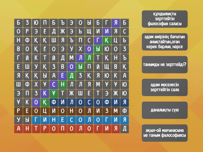 құндылық - адам өмірінің бағытын анықтайтын,оған керек барлық нәрсе, оксеология - құндылықты зерттейтін философия саласы, антропология - адам мәселесін зерттейтін сала, гинесология - танымды не зерттейді?, реоционолизм - ақыл-ой мағынасына ие таным философиясы, философия - даналықты сүю,