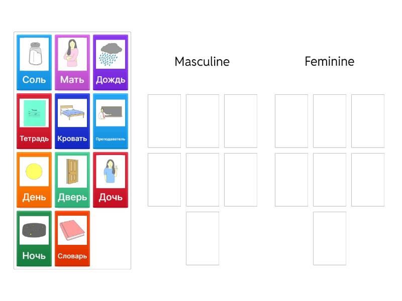 Masculine: День, Преподаватель, Дождь, Словарь, Feminine: Тетрадь, Дверь, Мать, Дочь, Соль, Кровать, Ночь,