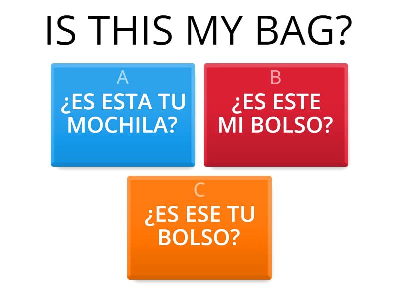 1) IS THIS MY BAG? a) ¿ES ESTA TU MOCHILA? b) ¿ES ESTE MI BOLSO? c) ¿ES ESE TU BOLSO? 2) IS THAT YOUR PENCIL? a) SON AQUELLOS TUS SCAPUNTAS? b) ¿ES ESE TU BOLIGRAFO? c) ¿ES ESE TU LAPIZ? 3) ARE THOSE HER RULERS? a) ES ESA SU REGLA? b) SON ESAS SUS REGLA? c) SON ESAS SUS REGLAS? 4) THIS IS NOT HIS MARKER a) ES ESE TU MARCADOR b) ESE NO ES SU MARCADOR c) ESTE NO ES SU MARCADOR 5) DO YOU HAVE ANY ERASER? a) ¿TIENES ALGUN MARCADOR? b) ¿TIENES ALGUN BORRADOR? c) ¿NO TIENES ALGUN MARCADOR? 6) I DON´T HAVE ANY PEN a) NO TENGO LAPICERO b) NO TIENES LÁPIZ c) NO TENGO NINGUN LÁPIZ 7) IS THAT OUR SHARPENER? a) ¿SON ESOS NUESTROS SACAPUNTAS? b) ¿ES ESTE NUESTRO SACAPUNTAS? c) ¿ES ESE NUESTRO SACAPUNTAS? 8) THIS IS THEIR BOOK a) ESE ES EL LIBRO DE ELLOS b) ESE NO ES EL LIBRO DE ELLOS c) ESTE ES EL LIBRO DE ELLOS 9) WHERE IS HIS GLUE? a) ¿DONDE ESTAN MIS PEGAMENTOS? b) ¿DONDE ESTA EL PEGAMENTO DE ÉL? c) DONDE ESTA EL PEGAMENTO DE ELLA? 10) DO YOU HAVE ANY TAPE? a) ¿ELLA TIENE CINTA? b) ¿TIENES CINTA? c) ¿TIENE ÉL CINTA? 11) DO YOU HAVE ANY SHARPENER? a) YES, I GO b) YES, I DO c) NO, I DIDN´T 12) DOES SHE HAVE ANY PENCILCASE? a) NO, SHE IS b) NO, SHE DOES c) NO, SHE DOESN´T