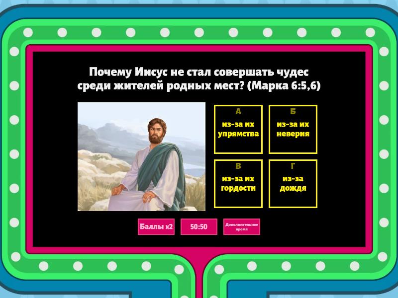 1) Почему Иисус не стал совершать чудес среди жителей родных мест? (Марка 6:5,6) a) из-за их упрямства b) из-за их неверия c) из-за их гордости d) из-за дождя 2) Павел советует нам смотреть на то, что вечно. На что именно? (2 Коринфянам 4 :18) a) на огонь b) на воду c) "на невидимое" d) на цветы 3) Сколько денег положила бедная вдова в сокровищницу? ( Марка 12 : 42) a) две копейки b) две монетки c) два доллара d) два евро 4) В чем дочь фараона нашла Моисея? ( Исход 2:5) a) в капусте b) в корзинке c) в сумке d) аист принес 5) Что не может делать Бог? ( Евреям 6:18) a) лгать b) гневаться c) стыдится d) загорать 6) Как поступил Иисус чтобы избежать побития камнями? (Иоанна 8:59) a) одел шапку невидимку b) спрятался c) убежал d) скрылся 7) При помощи чего Бог сотворил материальную Вселенную? (Бытие 1:2) a) волшебной палочки b) пластилина c) своего духа d) искусственного интелекта 8) Что о нас знает Бог? (Матфея 10:30) a) что мы ели на завтрак b) сколько волос у нас на голове c) какой смартфон мы хотим d) на каком боку спали 9) Как звали жену Адама? (Бытие 3:20) a) Елена b) Евдокия c) Ева d) Есения 10) Что делал Даниил три раза в день? (Даниила 6:10) a) кушал b) гулял с друзьями c) молился d) принимал душ 11) На чем Иисус въехал в Иерусалим? ( Иоанна 12:14) a) на самокате b) на Мерседесе c) на осленке d) на роликах 12) Чем Иисус вытер ноги ученикам? ( Иоанна 13:5) a) салфетками b) полотенцем c) одеждой d) шторой 13) Отцом чего Иисус назвал Сатану? (Иоанна 8:14) a) зависти b) лжи c) зла d) ненависти 14) Что ели евреи в пустыне? (Иоанна 6:31) a) колбасу b) манну c) мивину d) инжир в шоколаде 15) Что нужно сделать, чтобы "войти сквозь узкие врата"? (Луки 13:2) a) заняться спортом b) приложить все усилия c) сесть на диету d) правильно питаться