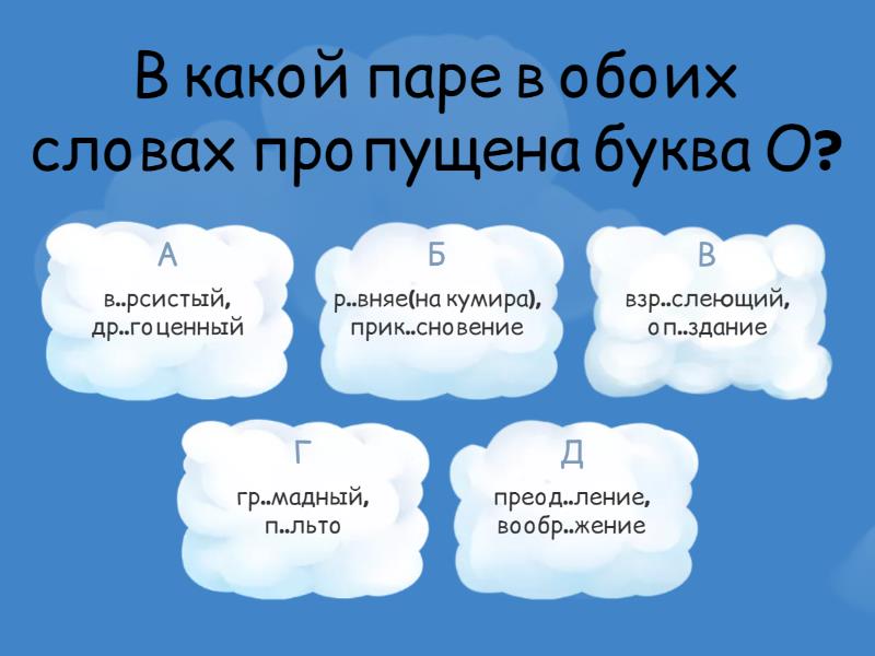 1) В каком слове пропущена проверяемая безударная гласная корня? a) п..ссимим b) д..лжностной c) г..товность d) п..следствия e) б..лерина 2) В каком слове пропущена проверяемая безударная гласная корня? a) усм..ряет b) подн..мается c) прик..сался d) пол..жение e) бл..снуть 3) В каком слове пропущена проверяемая безударная гласная корня? a) ок..ймляет b) ос..знание c) расст..яние d) из..гнулась e) пр..пускной 4) В каком слове пропущена проверяемая безударная гласная корня? a) словосоч..тание b) приск..кал c) обж..гающий d) р..внодушие e) сд..ржался 5) В каком слове пропущена непроверяемая безударная гласная корня? a) без..ружный b) тв..рец c) р..скошный d) г..ловной e) исп..кла 6) В каком слове пропущена непроверяемая безударная гласная корня? a) пл..нил b) непок..рённый c) с..поги d) п..тьсот e) бл..жайший 7) В каком слове пропущена чередующаяся безударная гласная корня? a) м..ханик b) обн..ружить c) бл..годарный d) т..вары e) нач..наешь 8) В каком слове пропущена чередующаяся безударная гласная корня? a) к..нал b) обр..мление c) пл..вучий d) сп..раль e) в..сок 9) В какой паре в обоих словах пропущена одна и та же буква? a) оз..рилась, раств..рилась b) см..тение, просв..щённый c) пон..ля, нем..нуемо d) с..реневый, су..тливый e) отр..слевой, об..яние 10) В какой паре в обоих словах пропущена буква И? a) просв..рлил, св..рель b) ф..лософ, угн..татели c) (зажать) в т..ски, вел..чина d) про..ни, ул..тучился e) заж..гательно, изв..щение 11) В какой паре в обоих словах пропущена буква О? a) в..рсистый, др..гоценный b) р..вняе(на кумира), прик..сновение c) взр..слеющий, оп..здание d) гр..мадный, п..льто e) преод..ление, вообр..жение 12) В какой паре в обоих словах пропущена буква Е? a) пост..пенно, экстр..мальный b) др..безжание, соз..дание c) м..нувшие подж..дает d) ог..бает, о..тает e) и..ваются, об..тают