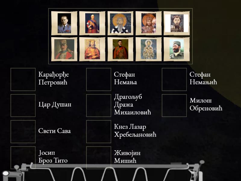 Стефан Немања, Свети Сава, Цар Душан, Кнез Лазар Хребељановић, Карађорђе Петровић, Милош Обреновић, Живојин Мишић, Јосип Броз Тито, Драгољуб Дража Михаиловић, Стефан Немањић,