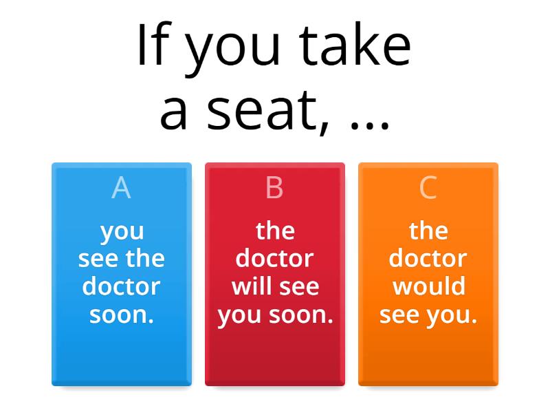 1) If you take a seat, ... a) you see the doctor soon. b) the doctor will see you soon. c) the doctor would see you. 2) If you will insist on going out without a coat, ... a) you often catch colds. b) you would probably catch a cold c) it’s no wonder you’ve caught a cold 3) If he won’t stop talking, ... a) I’ll just have to interrupt him. b) I’d have to interrupt him. c) I’ve stopped listening to him. 4) I’ll make you a cup of coffee ... a) if it’ll help you feel more awake. b) if you were to feel more awake. c) if you’re going to feel more awake. 5) You ought to go and buy the ingredients a) if you keep on making dinner tonight. b) if you had made dinner. c) if you’re going to make dinner tonight. 6) If she would just help me around the house a bit more, ... a) I’m always feeling tired and overworked. b) I wouldn’t feel so tired and overworked. c) I don’t feel so tired all the time. 7) If you happen to go to the city centre, ... a) you’ll see that there are a lot of new buildings. b) you’d see lots of new buildings. c) you would have seen all the new buildings. 8) If I were to ask you to come with me to the cinema tonight, ... a) would you have said ‘yes’? b) you’ll probably say ‘yes’ c) would you say ‘yes’?