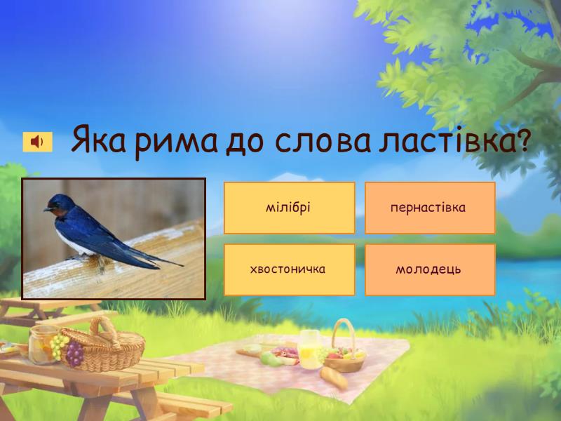 1) Яка рима до слова ластівка? a) мілібрі b) пернастівка c) хвостоничка d) молодець 2) Яка рима до слова колібрі? a) мілібрі b) пернастівка c) Хвостоничка d) молодець 3) яка рима до слова горобець? a) мілібрі b) Пірнастівка c) Хвостоничка d) молодець 4) яка рима до слова синичка? a) Мілібрі b) пірнастівка c) Хвостоничка d) молодець