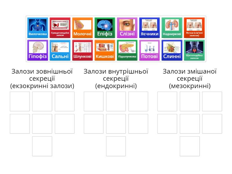 Залози зовнішньої секреції (екзокринні залози): Слинні, Потові, Сальні, Шлункові, Молочні, Слізні, Кишкові, Залози внутрішньої секреції (ендокринні): Гіпофіз, Епіфіз, Щитоподібна залоза, Прищитоподібні залози, Вилочкова, Надниркові, Залози змішаної секреції (мезокринні): Підшлункова, Яєчка (сім'яні залози), Яєчники,