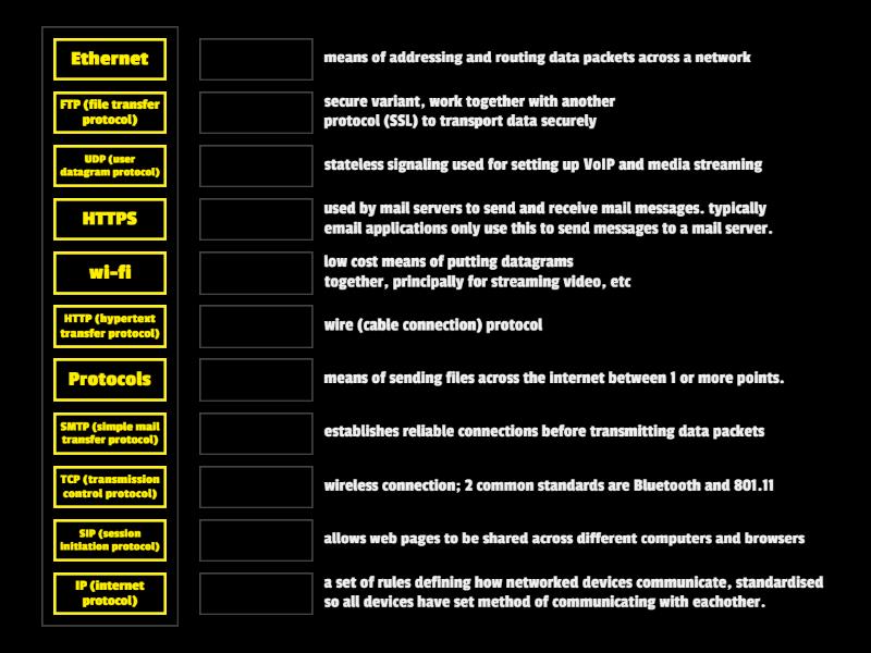 Protocols - a set of rules defining how networked devices communicate, standardised so all devices have set method of communicating with eachother., Ethernet - wire (cable connection) protocol, wi-fi - wireless connection; 2 common standards are Bluetooth and 801.11, TCP (transmission control protocol) - establishes reliable connections before transmitting data packets, IP (internet protocol) - means of addressing and routing data packets across a network, UDP (user datagram protocol) - low cost means of putting datagrams together, principally for streaming video, etc, SIP (session initiation protocol) - stateless signaling used for setting up VoIP and media streaming, HTTP (hypertext transfer protocol) - allows web pages to be shared across different computers and browsers, HTTPS - secure variant, work together with another protocol (SSL) to transport data securely , SMTP (simple mail transfer protocol) - used by mail servers to send and receive mail messages. typically email applications only use this to send messages to a mail server., FTP (file transfer protocol) - means of sending files across the internet between 1 or more points.,