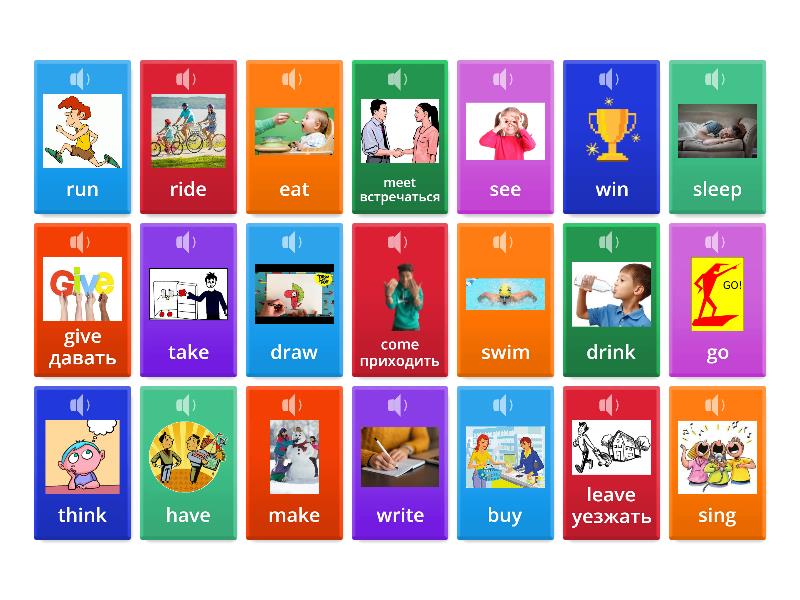 go - went, have - had, see - saw, make - made, write - wrote, buy - bought, eat - ate, sing - sang, come приходить - came, ride - rode, give давать - gave, drink - drank, draw - drew, take - took, win - won, sleep - slept, think - thought, run - ran, swim - swam, meet встречаться - met, leave уезжать - left,