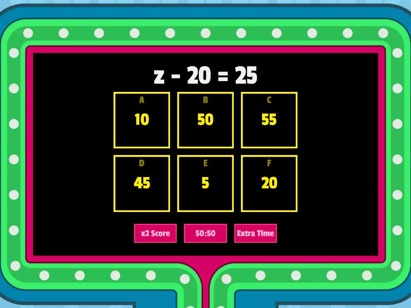 1) z - 20 = 25 a) 10 b) 50 c) 55 d) 45 e) 5 f) 20 2) 8m = 88 a) 12 b) 10 c) 18 d) 22 e) 1 f) 11 3) g - 107 = 17 a) 114 b) 124 c) 90 d) 69 e) 224 f) 314 4) 6 + k =18 a) 6 b) 10 c) 22 d) 24 e) 12 f) 3 5) b➗4 = 8 a) 36 b) 24 c) 18 d) 32 e) 54 f) 84 6) 12e = 144 a) 1728 b) 132 c) 156 d) 13 e) 14 f) 12 7) 44 - a = 20 a) 14 b) 24 c) 64 d) 34 e) 10 f) 16 8) 81➗ y = 3 a) 24 b) 27 c) 9 d) 6 e) 37 f) 36