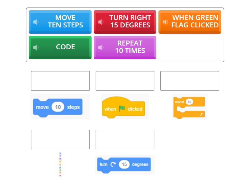 CODE, MOVE TEN STEPS, TURN RIGHT 15 DEGREES, REPEAT 10 TIMES, WHEN GREEN FLAG CLICKED,