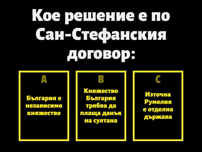 1) Кое решение е по Сан-Стефанския договор: a) България е независимо княжество b) Източна Румелия е отделна държава c) Княжество България трябва да плаща данък на султана 2) Кое решение НЕ е по Берлинския конгрес a) Южна Добруджа минава към Румъния b) Северна Добруджа минава към Румъния c) Пирот преминава към Сърбия d) Ниш преминава към Сърбия 3) От какво е съкращение ВРУ? a) Вътрешно революционно управление b) Временно руско управление c) Външно руско управление d) Вражеско революционно управление 4) Кой НЕ е бил начело на Гражданската канцелария? a) Владимир Черкаски b) Александър Дондуков c) Граф Игнатиев 5) Кой е начело на Отдела за Просвещението по време на ВРУ? a) Захари Стоянов b) Марин Дринов c) Петко Каравелов 6) Какво НЕ влиза в задачите на ВРУ? a) Да подготви местната администрация b) Да организира Учредително събрание c) Да наложи руския език 7) Какво се случва на Учредителното събрание в Търново a) Приема се Конституцията на Княжество България b) Избира се княз на Княжество Бъллгария c) Избира се първият премиер на България 8) Кога е приета Търновската конституция? a) 23 май 1879 г. b) 16 април 1879 г. c) 14 май 1879 г. d) 18 септември 1878 г. e) 6 септември 1879 г. f) 16 април 1878 г. 9) Как е оценена Търновската конституция? a) По-скоро либерална b) По-скоро консервативна 10) Кой е първият княз на Княжество България? a) Батенберг b) Фердинанд c) Пепи 11) Кой е първият министър-председател на Княжество България? a) Петко Каравело b) Стефан Стамболов c) Драган Цанков d) Тодор Бурмов e) Васил Радославов f) Стоян Данев 12) Според Търновската конституция право да гласуват имат: a) Всички граждани над 21 г. b) Само граждани с висше образование c) Само граждани с имущество d) Всички граждани над 18 г. 13) Какво се случва по време на "Режима на пълномощията"? a) Батенберг управлява с извънредно законодателство b) Фердинанд забранява всички партии c) Стефан Стамболов вкарва опозицията в затвора 14) Дата на Съединението: a) 6 септември 1885 b) 6 септември 1886 c) 22 септември 1885 d) 22 септември 1886 15) Кой е начело на БТЦРК, основан в Пловдив с цел Съединение a) Петко Каравелов b) Васил Радославов c) Захари Стоянов 16) Вестник "Борба" е орган на: a) На Народната партия b) На ВМОРО c) На БТЦРК (Пловдив) d) На Либералната партия 17) Къде първо започва съединистката акция a) На 2 септ. в Панагюрище b) На 5 септ. в Пазарджик c) На 1 септ. в Копривщица 18) Кой е арестуван при Съединението? a) Гаврил Кръстевич b) Алеко Богориди c) Стефан Стамболов 19) Коя държава обявява война на България след Съединението? a) Румъния b) Османската империя c) Сърбия d) Гърция 20) Кои боеве са известни от Сръбско-българската война: a) При Сливница b) При Дойран c) При Чаталджа 21) Съединението е признато с: a) Топханенски акт b) Нишки договор c) Варненски акт 22) Кой е на изображението? a) Петко Каравелов b) Драган Цанков c) Васил Радославов