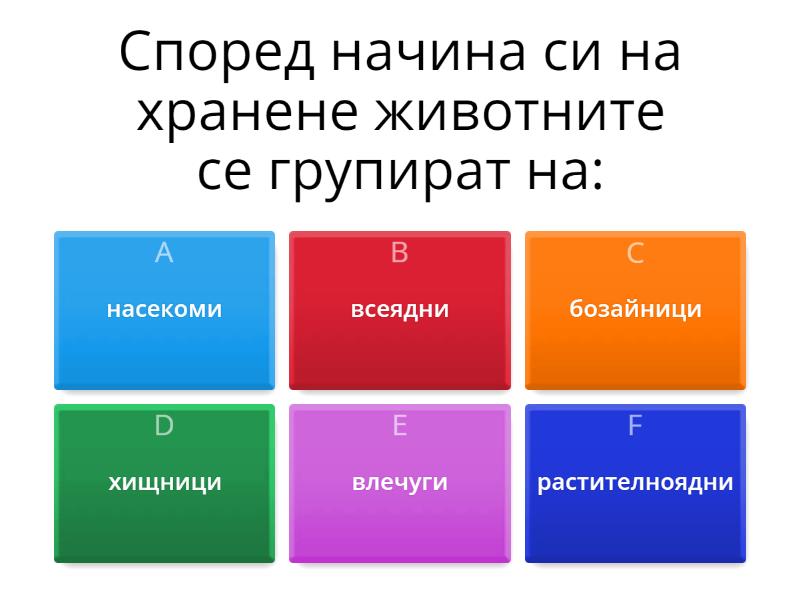 1) Според начина си на хранене животните се групират на: a) растителноядни b) насекоми c) влечуги d) хищници e) бозайници f) всеядни 2) Гръбначни животни са: a) риба b) врабче c) мравка d) куче e) пеперуда f) скакалец 3) Безгръбначни са: a) калинка b) щъркел c) муха d) акула e) бръмбар f) елен 4) Какво не е характерно за насекомите a) тялото им е от три части b) имат шест крака c) покрити са с люспи d) повечето имат криле e) срещат се навсякъде f) снасят яйца 5) Рибите са характерни с това, че a) дишат с хриле b) имат гола влажна кожа c) снасят яйца на сушата d) имат четири крака e) грижат се за малките си f) произвеждат мляко за малките 6) При птиците е характерно, че a) имат четири крака b) снасят яйца във водата c) имат суха люспеста кожа d) тялото им е от три части e) дишат с бели дробове f) имат перки 7) Бозайниците a) имат перки b) повечето са покрити са с косми c) раждат живи малки d) дишат с бели дробове e) имат криле f) снасят яйца 8) Кое не е характерно при влечугите a) имат криле b) имат четири крака c) грижат се за малките си d) имат гола влажна кожа e) дишат с бели дробове f) снасят яйца на сушата, малките приличат на възрастните 9) Земноводните a) повечето снасят яйца във водата b) имат гола влажна кожа c) имат суха люспеста кожа d) грижат се за малките e) дишат с бели дробове f) имат четири крала 10) От коя група са следните гръбначни животни a) риби b) влечуги c) бозайници d) земноводни e) насекоми f) птици