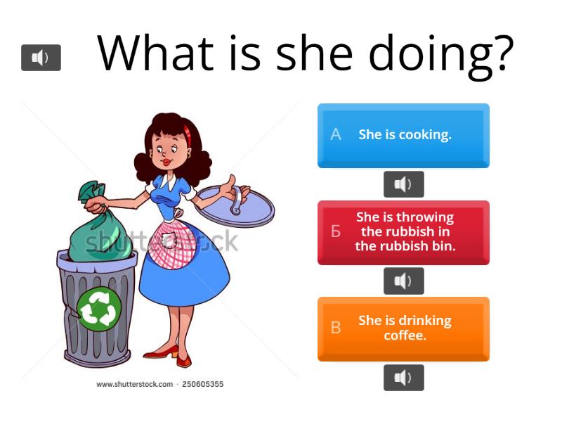 1) What is she doing? a) She is cooking. b) She is throwing the rubbish in the rubbish bin. c) She is drinking coffee. 2) What is he doing? a) He is drinking coffee. b) He is having a shower. c) He is taking photos. 3) What is she doing? a) She is taking photos. b) She is swimming. c) She is having breakfast. 4) What is he doing? a) He is drinking water. b) He is eating a sandwich. c) He is eating pizza. 5) What is he doing? a) He is having lunch. b) He is throwing rubbish. c) He is getting dressed. 6) What are they doing? a) They are talking. b) They are drinking. c) They are riding bikes.
