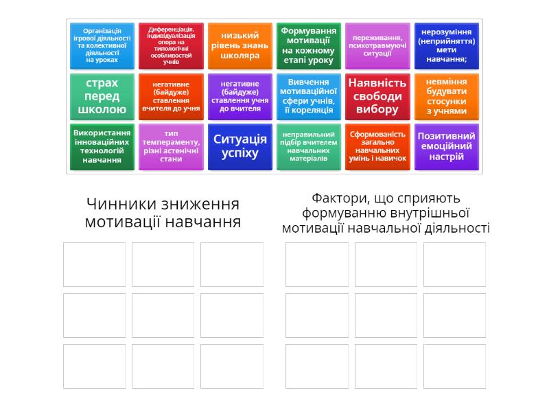 Чинники зниження мотивації навчання : невміння будувати стосунки з учнями, низький рівень знань школяра, переживання, психотравмуючі ситуації, тип темпераменту, різні астенічні стани, негативне (байдуже) ставлення учня до вчителя, негативне (байдуже) ставлення вчителя до учня, нерозуміння (неприйняття) мети навчання;, страх перед школою, неправильний підбір вчителем навчальних матеріалів, Фактори, що сприяють формуванню внутрішньої мотивації навчальної діяльності: Позитивний емоційний настрій, Вивчення мотиваційної сфери учнів, її кореляція, Ситуація успіху, Наявність свободи вибору, Сформованість загально навчальних умінь і навичок, Диференціація, індивідуалізація опора на типологічні особливостей учнів, Використання інноваційних технологій навчання, Організація ігрової діяльності та колективної діяльності на уроках, Формування мотивації на кожному етапі уроку,