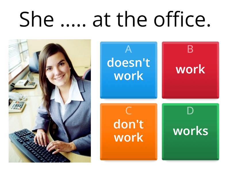 1) She ..... at the office. a) doesn't work b) work c) don't work d) works 2) My father ..... ....... cigarettes. (NOT) a) smokes b) smoke c) doesn't smoke d) don't smoke 3) I .... .... meat. (NOT) a) doesn't eat b) don't eat c) eat d) does eat 4) We often ..... to the radio. a) live b) listen c) drink d) listens 5) Alice and Mark .... ..... in London. (NOT) a) doesn't live b) don't live c) lives 6) You ..... to the cinema at weekends. a) go b) play c) goes d) plays 7) A teacher ________ in a school. a) doesn't work b) work c) don't work d) works 8) A waiter _________ in a shop. a) works b) work c) doesn't work d) don't work 9) Mary _______ her hair every morning. a) wash b) washes c) washs d) washing 10) Lewis and Ann _______ to the cinema on Fridays. a) goes b) don't go c) go 11) Janet ________ her homework after class. (NOT) a) doesn't b) don't do c) doesn't do d) don't