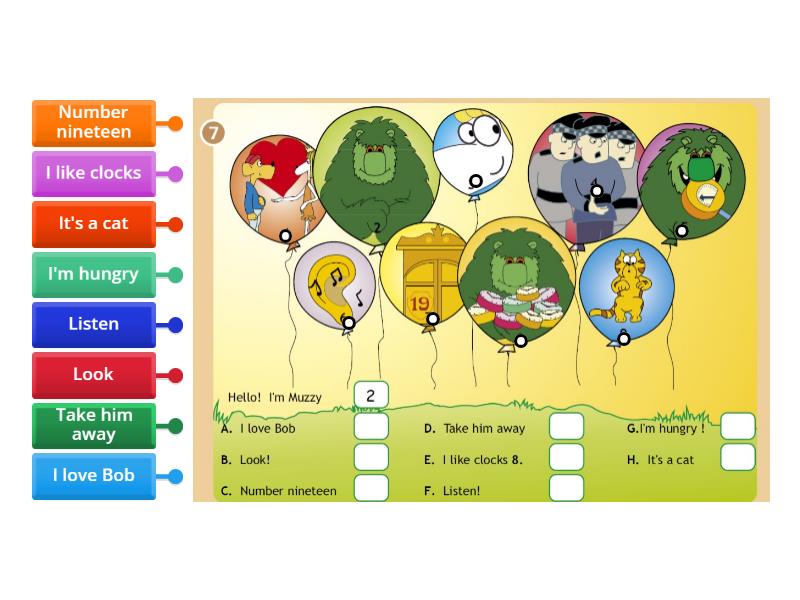 I love Bob, Look, Number nineteen, Take him away, I like clocks, Listen, I'm hungry, It's a cat.