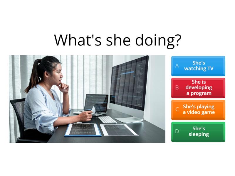 1) What's she doing? a) She's watching TV b) She is developing a program c) She's playing a video game d) She's sleeping 2) What's he doing? a) He's writing a message b) He's sleeping c) He's reading d) He's walking 3) What's he doing? a) He's swimming b) He's running c) He's drinking d) He's drawing 4) What are they doing? a) They're dancing b) They're writing c) They're cooking d) They're walking 5) What's she doing? a) She's writing b) She's shopping c) She's running d) She's watching tv 6) What's she doing? a) She's eating b) She's sleeping c) She's swimming d) She's shopping 7) What's she doing? a) She's drinking b) She's writing c) She's walking d) She's watching tv 8) What's she doing? a) She's cooking b) She's swimming c) She's shopping d) She's eating a sandwich 9) What's she doing? a) She's walking b) She's crying c) She's having lunch d) She's listening to music 10) What's he doing? a) He's swimming b) He's writing c) He's watching tv d) He's eating 11) What are they doing? a) They're running b) They're drinking c) They're walking d) They're sleeping 12) What are they doing? a) They're watching tv b) They're cooking c) They're drinking d) They're sleeping 13) What are they doing? a) They're walking b) They're shopping c) They're running d) They're watching tv 14) What are they doing? a) They're playing rugby b) They're playing soccer c) They're playing golf d) They're playing volleyball.