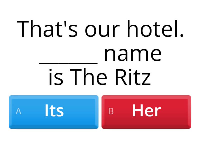 1) That's our hotel. ______ name is The Ritz a) Its b) Her 2) A: We're Mr and Mrs Davis. We have a reservation B: Yes, room 22. Here's _______ key a) their b) your 3) My brother is on holiday in Turkey with ______ friends a) her b) his 4) We are in class 4. ______ teacher is Miss Taylor. a) Their b) Our 5) She's my_______ a) wife's brother b) brother's wife 6) That's_______ a) phone's Tony b) Tony's phone 7) This is ______ room. Their names are Sylvia and Maria. a) our daughter's b) our daughters' 8) There are five________ in my family a) people's b) people 9) Those are _______ cars a) expensive b) expensives 10) This is a________ a) book very good b) very good book 11) I have________ a) a black umbrella b) an umbrella black 12) I prefer______ a) British films b) films British