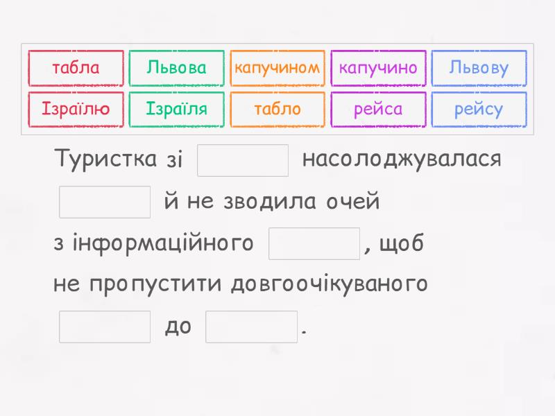 Туристка зі ____ насолоджувалася ____ й не зводила очей з інформаційного ____, щоб не пропустити довгоочікуваного ____ до ____.